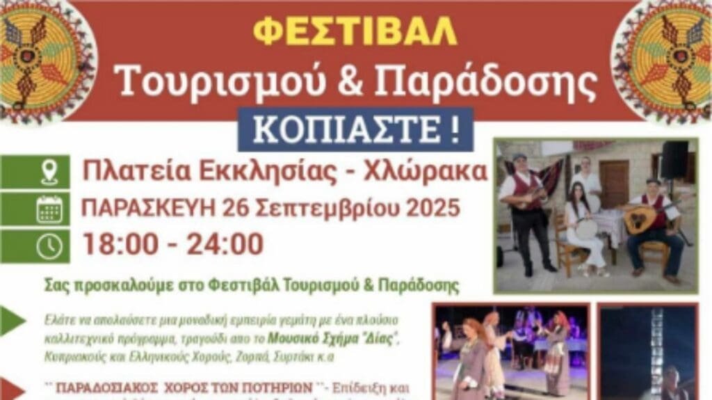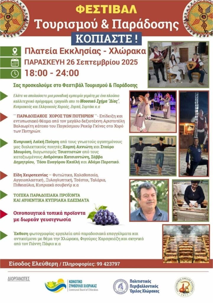 Η Κοινότητα Χλώρακας διοργανώνει την Παρασκευή 26 Σεπτεμβρίου, απο τις 8 το βράδυ εως τα μεσάνυχτα, Φεστιβάλ Τουρισμού & Παράδοσης.