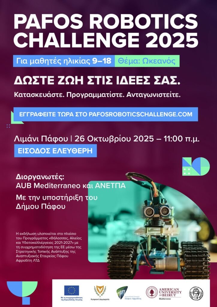 Οι ενδιαφερόμενοι μαθητές και εκπαιδευτές μπορούν να βρουν όλες τις λεπτομέρειες και να εγγραφούν τώρα στο pafosroboticschallenge.com