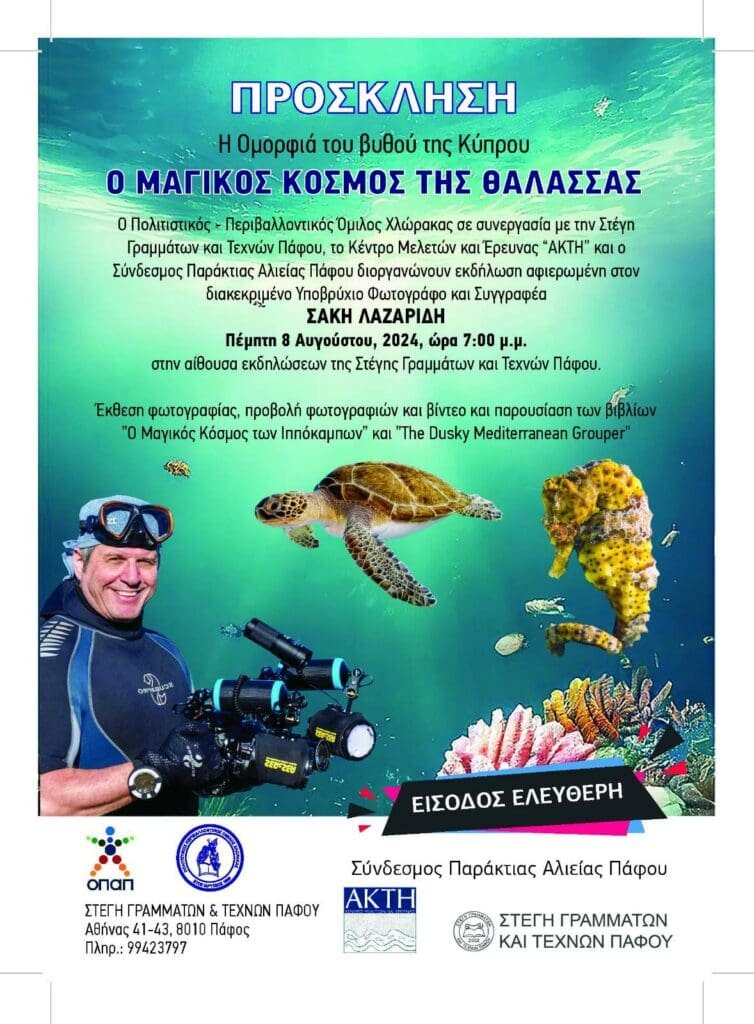 Ο Πολιτιστικός – Περιβαλλοντικός Όμιλος Χλώρακας σε συνεργασία με την Στέγη Γραμμάτων και Τεχνών Πάφου, την ΑΚΤΗ Project and Research Center και τον Σύνδεσμο Παράκτιας Αλιείας Πάφου, διοργανώνουν εκδήλωση αφιερωμένη στον διακεκριμένο Υποβρύχιο Φωτογράφο και Συγγραφέα ΣΑΚΗ ΛΑΖΑΡΙΔΗ την