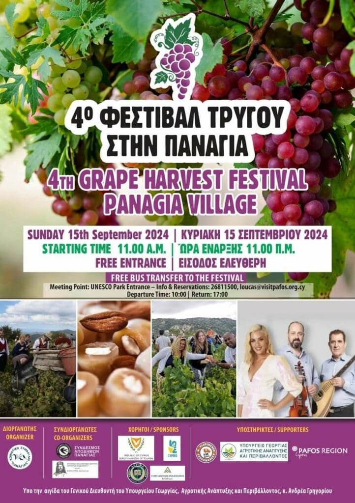 Η κοινότητα της Παναγιάς, γνωστή για τους αμπελώνες και την παράδοση που έχει στην παραγωγή κρασιού και στα προϊόντα σταφυλιού, φιλοξενεί την ερχόμενη Κυριακή, 15 Σεπτεμβρίου, το 4ο φεστιβάλ Τρύγου. Μια γιορτή αφιερωμένη στη διαδικασία του μαζέματος των σταφυλιών από τα αμπέλια.